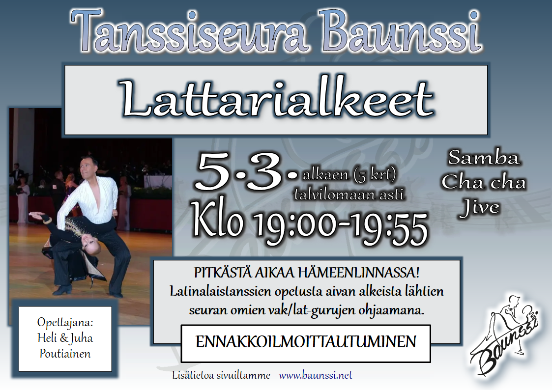 Olemme hämeenlinnalainen tanssiseura, joka on perustettu vuonna 2003. Kurssivalikoimaamme kuuluu rock'n'swing-tansseista mm. fusku, bugg ja boogie woogie. Lavatansseista valikoimassamme on mm. valssi, tango ja foksi, ja lattareista rumba-bolero, cha cha, jive ja salsa. Muitakin lajeja opetataan esim. lyhytkursseilla.