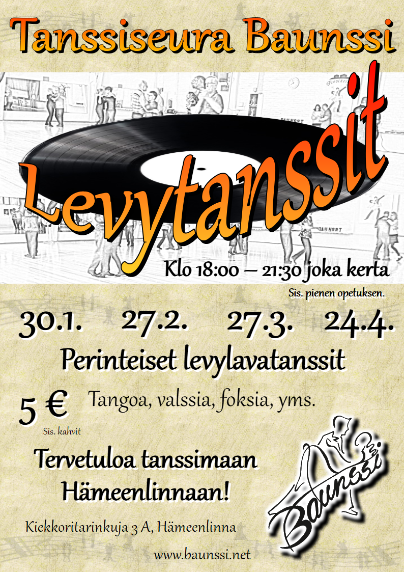 Levytanssit järjestetään Baunssin salilla. Kiekkoritarinkuja 3A, Hämeenlinna.